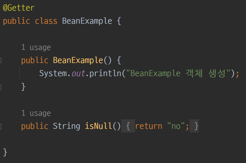 BeanExample 클래스의 isNull 메소드는 "no" 문자열을 반환한다.
