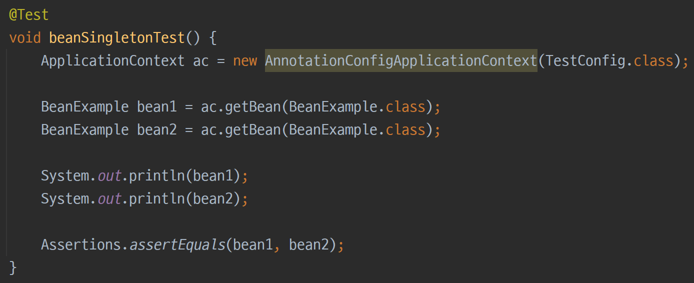 해당 테스트는 Bean은 Singleton으로 관리됨을 확인하는 목적이다.