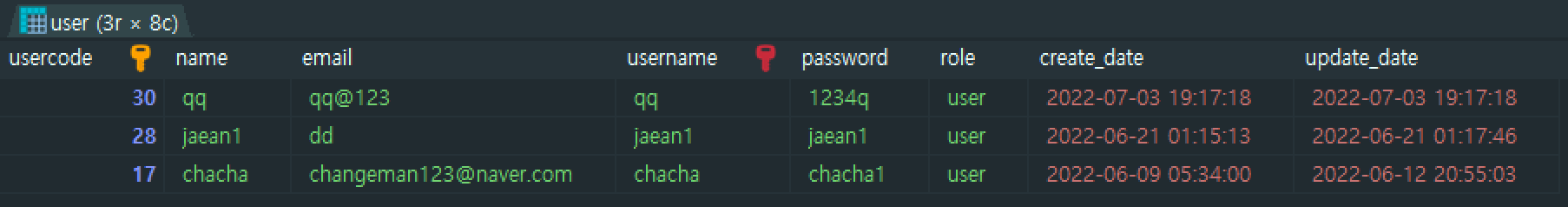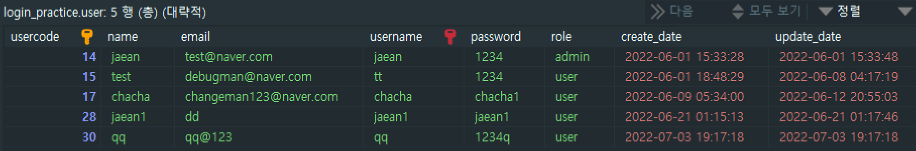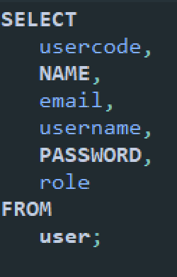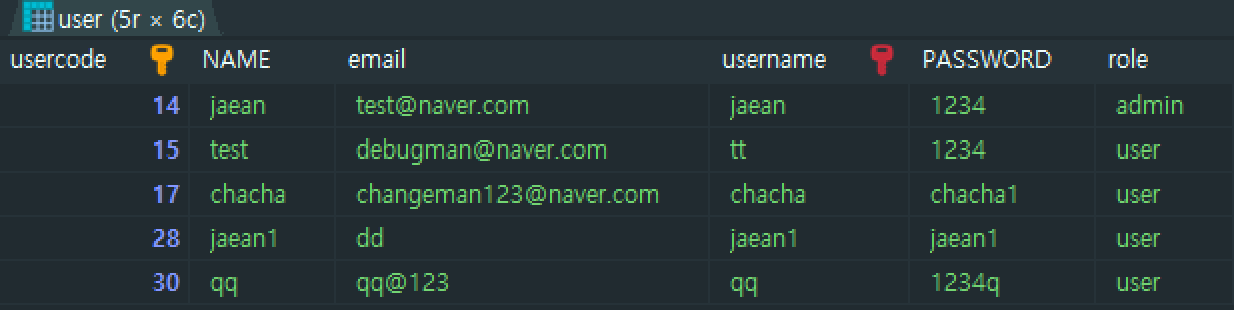 user 테이블의 모든 usercode, name, email, username, password, role 컬럼의 값들은 선택해 조회한다.