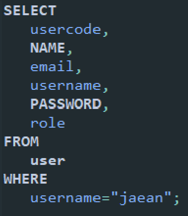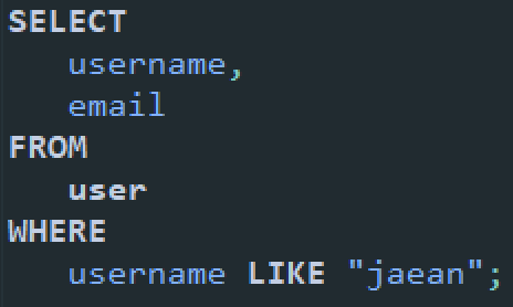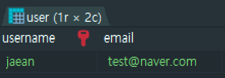 위와 같이 하면 DB에 존재하는 user 테이블에서 jaean이라는 username을 가진 사용자의 데이터를 조회할 수 있는 것이다.