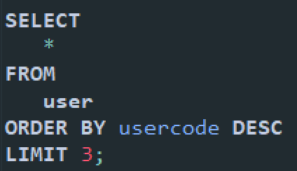 ORDER BY usercode DESC는 반환되는 튜플들을 usercode를 기준으로 Descending하게 정렬한다는 뜻이다.