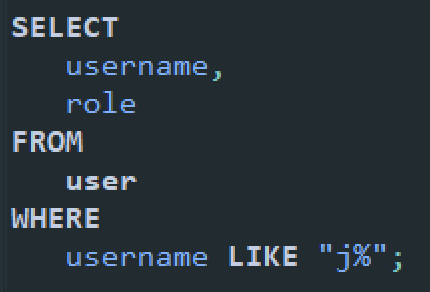 user 테이블에서 username이 j로 시작하는 모든 문자열을 선택했다.