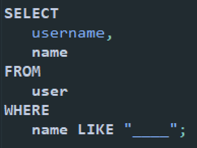 user 테이블에서 name이 4자리인 튜플의 username과 name을 선택하는 쿼리이다.